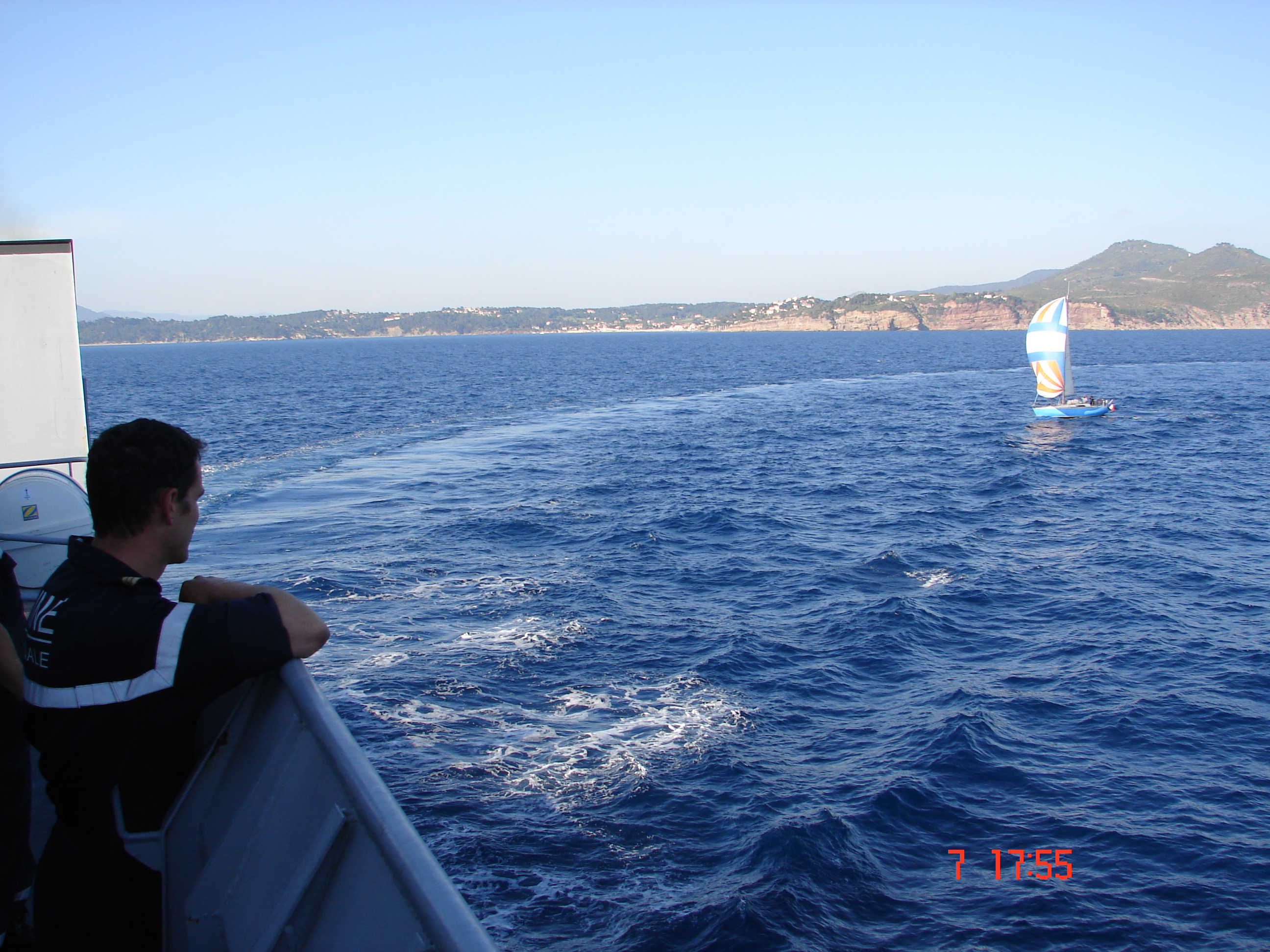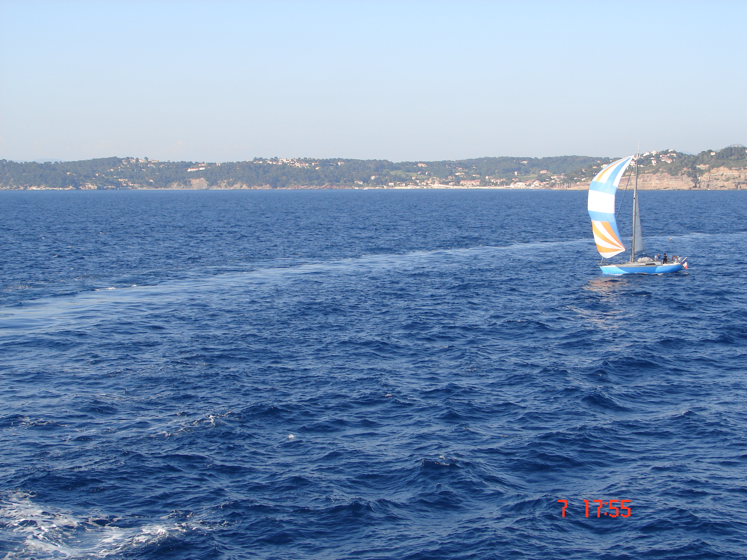 Voici quelques photos de mon venerable first 30 le "Zeph" prise par un de mes amis depuis un bateau beaucoup plus gros et beaucoup plus "gris" alors que nous étions de retour de Porquerolles avec une cargaison d 'une dizaine de cartons de l’excellent vin de cet île (qui depuis a bien sur été consommé avec modération
