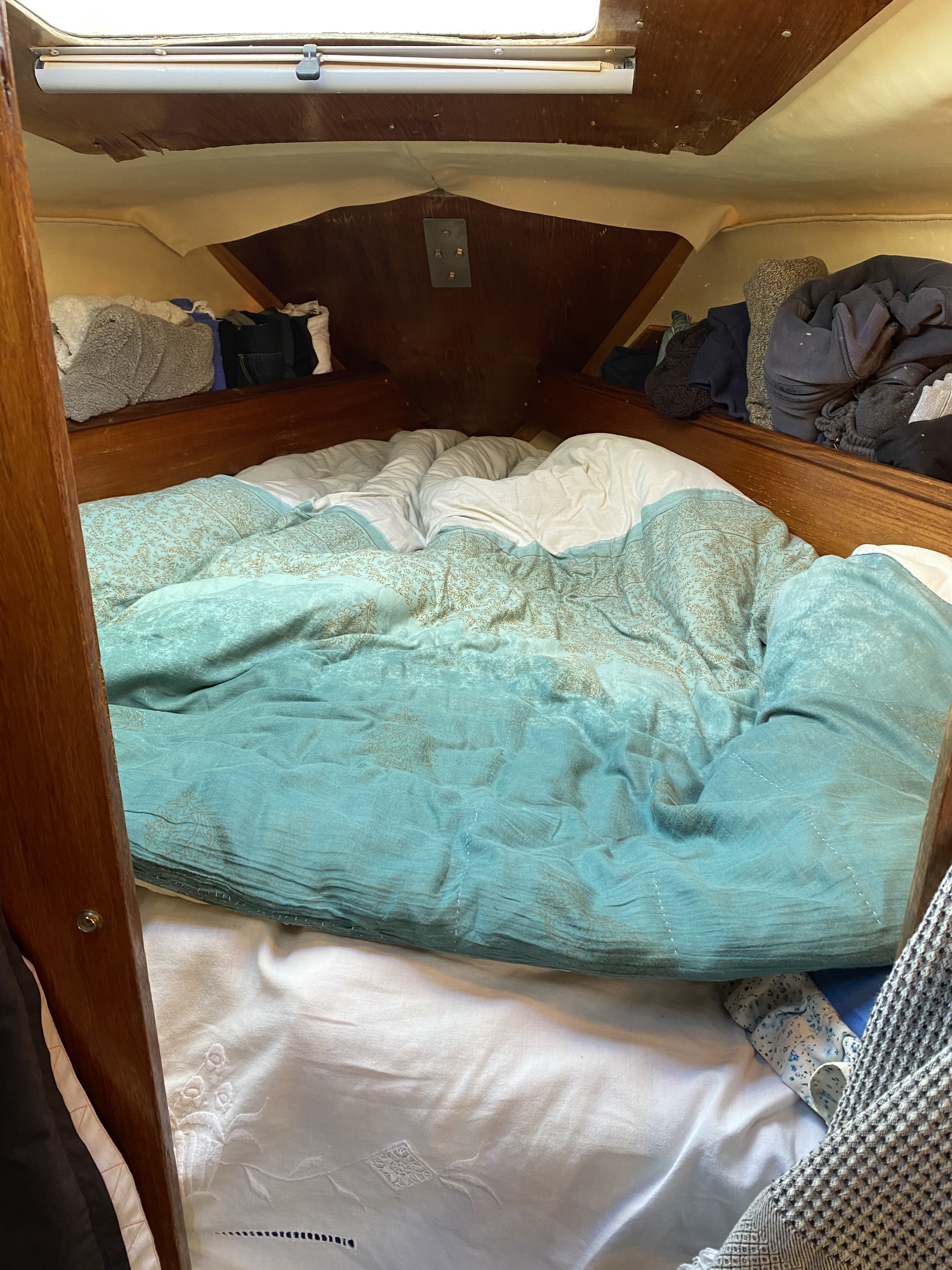 Cabine avant en pointe : deux longs équipets sur les côtés, coffres en dessous