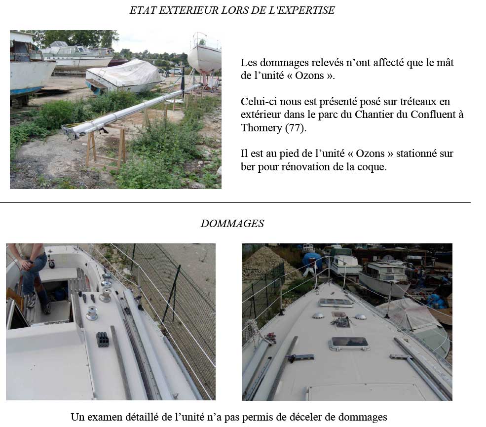 - Mat complet ( barre de flèche, semelle, sans courant, sans messager, sans antenne, sans feu de tête de mat, sans ferrure d'étai largable et avec un "pet" à 2m de la base au niveau du rail de coulisseau. Ce coup a été porté par vandalisme alors que le mat était posé sur le bateau, en remontant la Seine par un pavé jeté du pont de Bougival. Du fait de ce coup le mat n'est plus utilisable pour naviguer. Support d'éolienne ? d'antenne ?... longueur 10,5 m