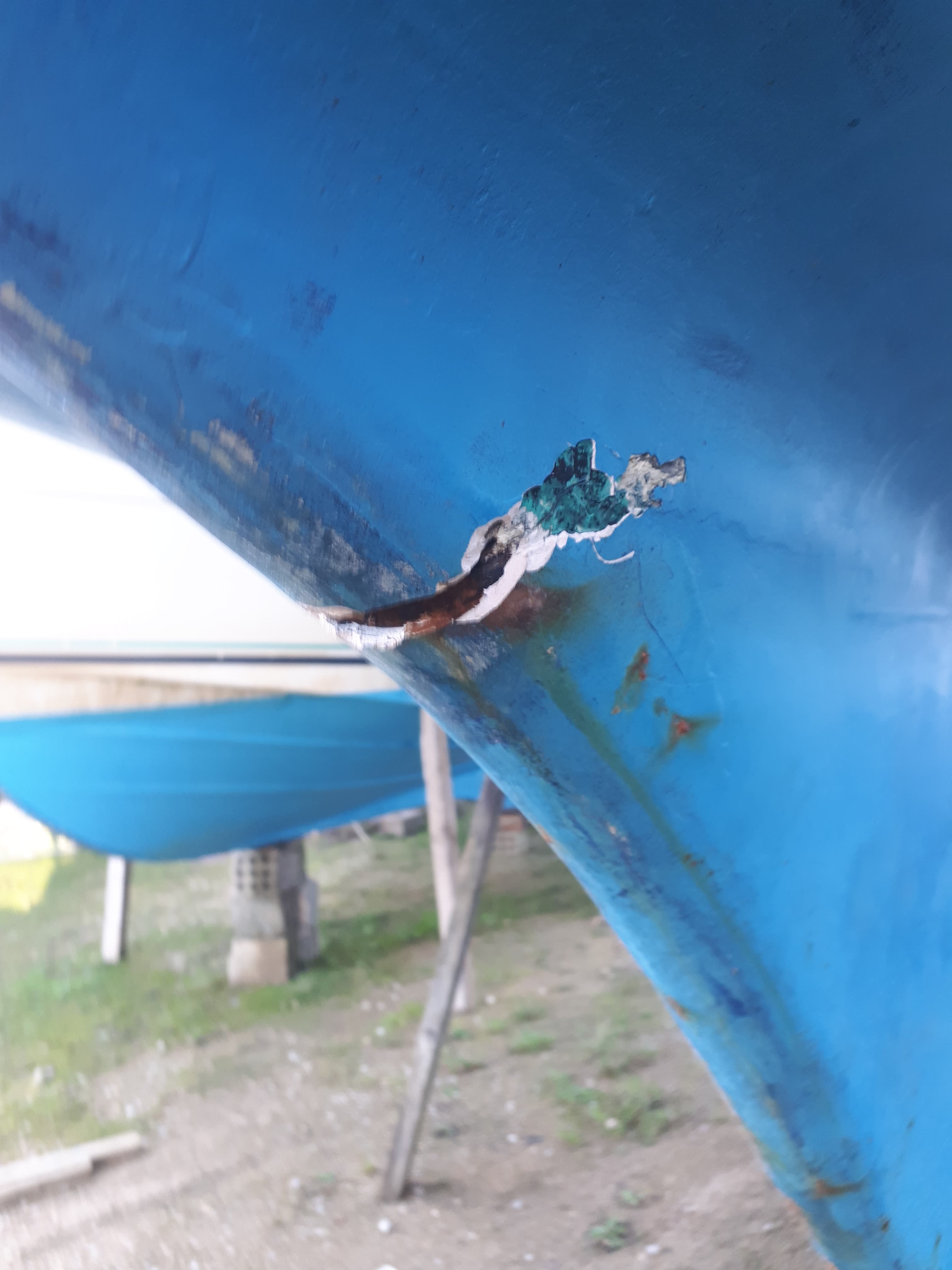 Après avoir sorti mon bateau de l'eau je me suis rendu compte d'une fissure à l'avant de la quille. J'ai creusé un peu, je n'y ai enlevé que du mastique ou autre enduit. Cette fissure est assez profonde mais pas si grande car elle se situe avant le premier boulon de quille.
