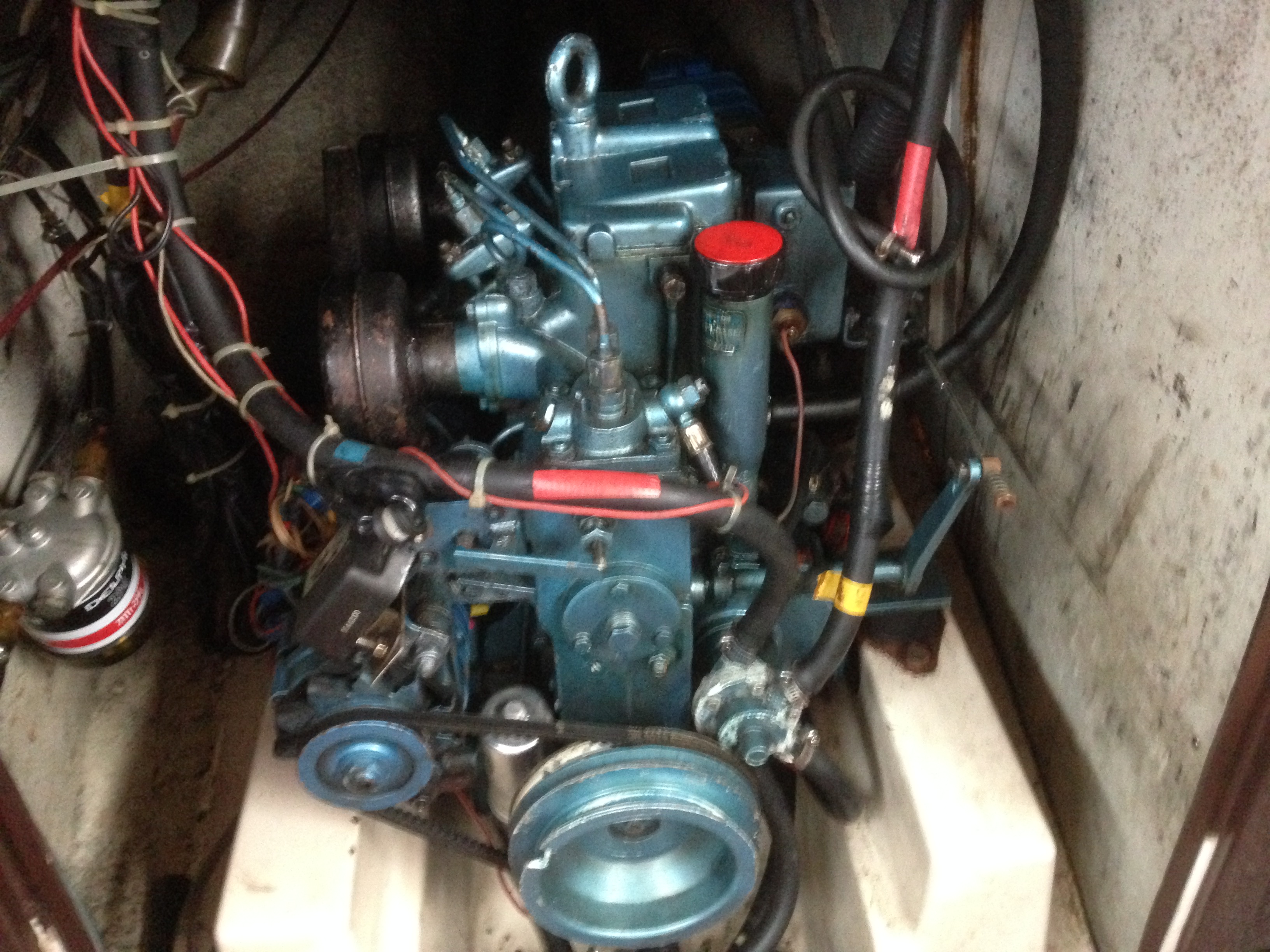 Correction: la photo du moteur Yanmar ci dessus comporte une légende erronée : l’ancien moteur, le Renault Couach RC16D figure ci dessous. Bref: Yanmar = gris, Renault = bleu.