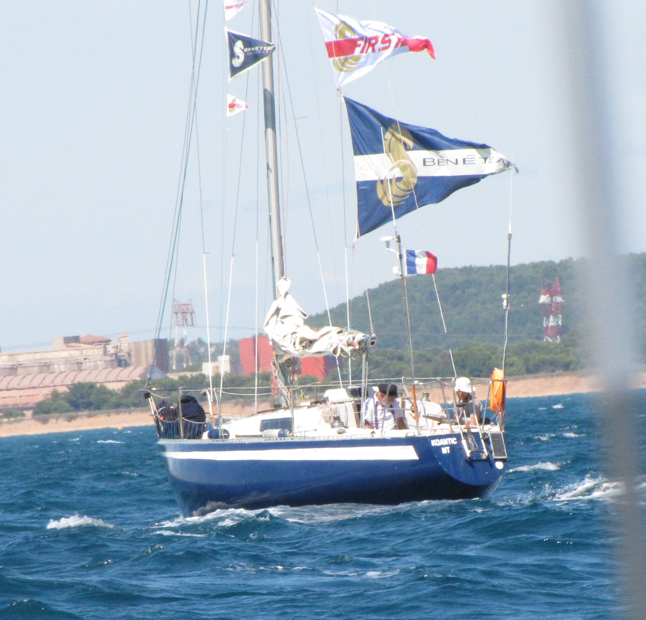 Nous a joué la grande coquette et a tenu à remonter le golfe vent dans le nez jusqu'au port. Arrivée à 16h ! Bon, sur 10 mois ça ne fait que 0,5/1000 d'erreur sur le parcours. Je propose une réunion du bureau* pour voir si on passe l'éponge sur ce scandale... Ses amis à l'arrivée, Madame et Fifille et l'équipage de TIPLOUF, seul participant de notre shite bien aimé. Faut-il faire l'aller retour sur Mars pour avoir un peu plus de monde ?